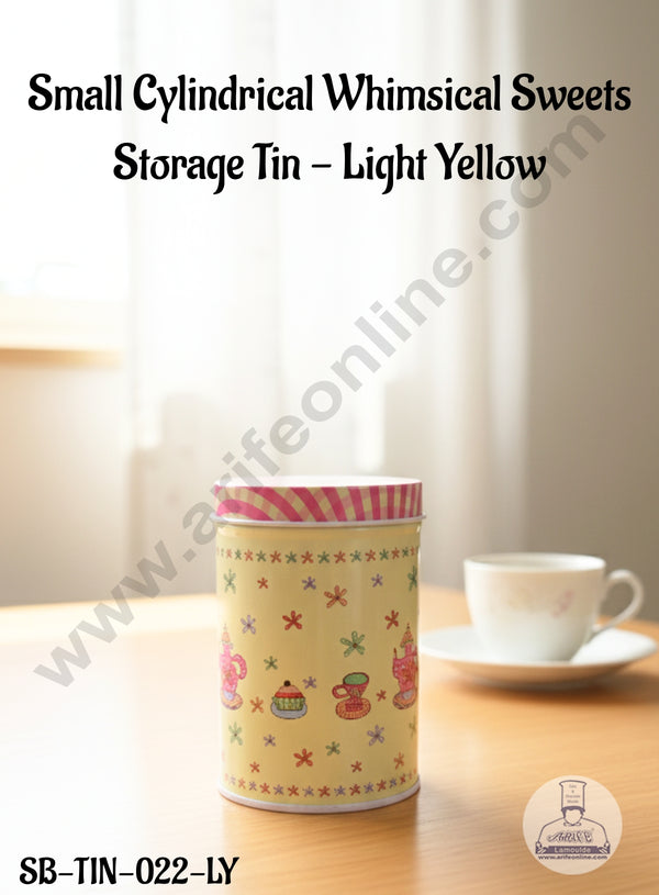 CAKE DECOR™ Small Cylindrical Whimsical Sweets Storage Tin - Light Yellow │Height: 11 cm x Diameter: 7.5 cm │