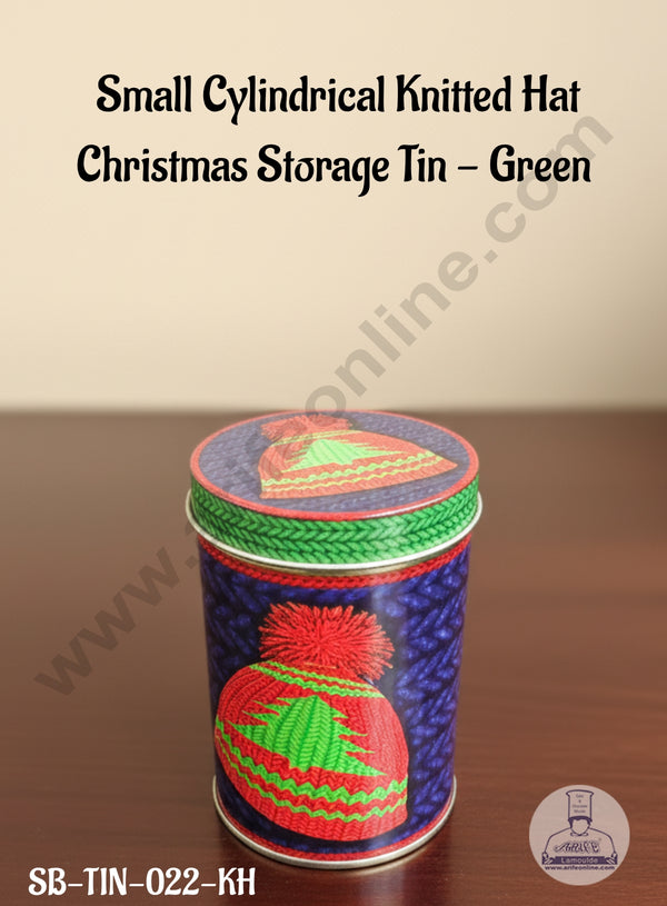 CAKE DECOR™ Small Cylindrical Knitted Hat Christmas Storage Tin - Green │Height: 11 cm x Diameter: 7.5 cm│