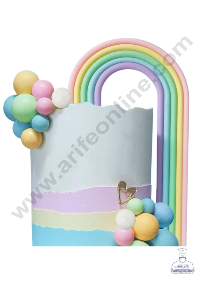 This is a decorative cake topper designed in the shape of a rainbow, featuring a soft, pastel colour scheme and a simple, curved design. It is likely used as a vertical decoration on celebration cakes.