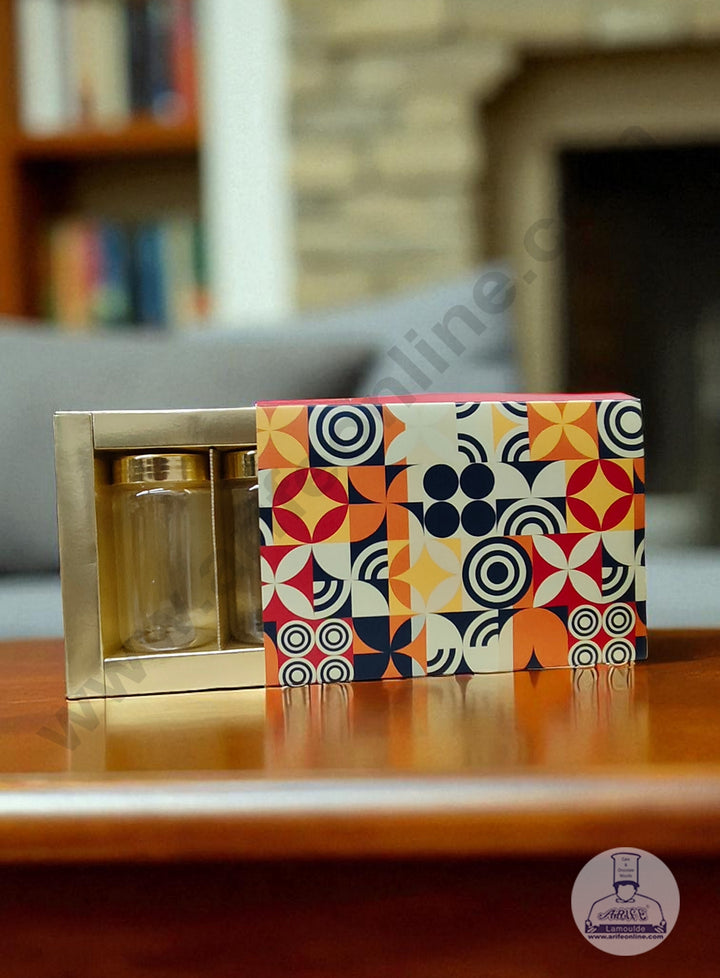 • Pattern & Colour: Pattern: The box is wrapped in a vibrant, highly decorative, and contemporary geometric pattern. This design is composed of circles, semi-circles, diamonds, and stylized four-petal flowers (or stars). The overall aesthetic is mid-century modern or abstract. Colour Palette: The main color scheme is rich and warm, featuring a mix of dark blue/black, mustard yellow/gold, cream/tan, and a deep reddish-orange/terracotta. The top edge of the box is a solid, contrasting red colour. The hardware (handle) is gold.