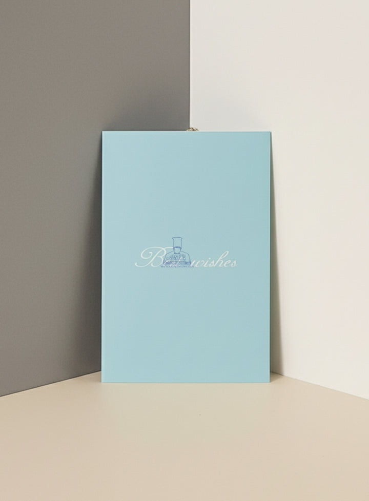 5. Border: A thin, light blue border frames the entire card, matching the dominant blue in the floral arrangement and text.