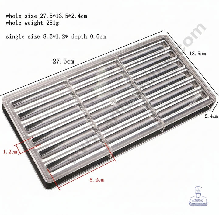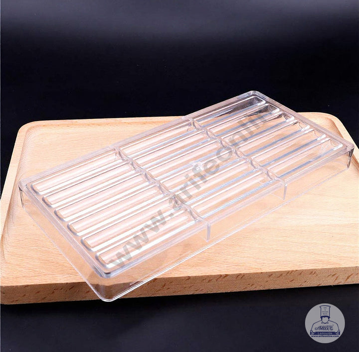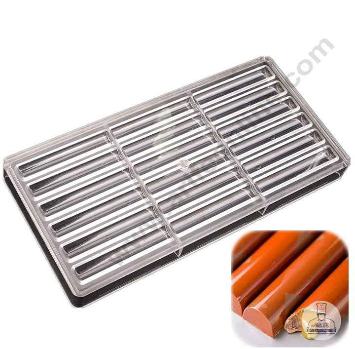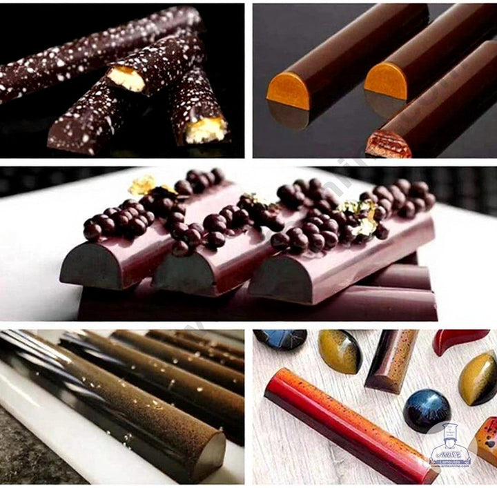 • Shape: Long Stick / Pipe / Cylinder Shape. The cavities are long, thin, and hollowed out in a semi-circular or cylindrical depression, resulting in a sleek, elegant, full-round stick or pencil-shaped chocolate piece.