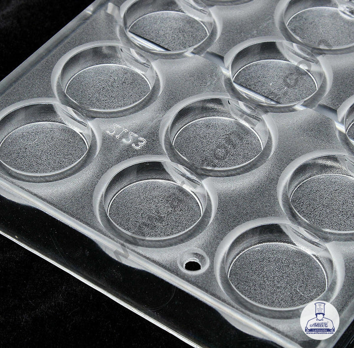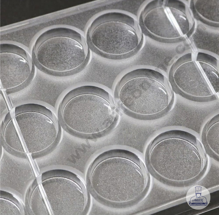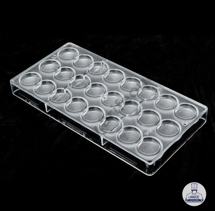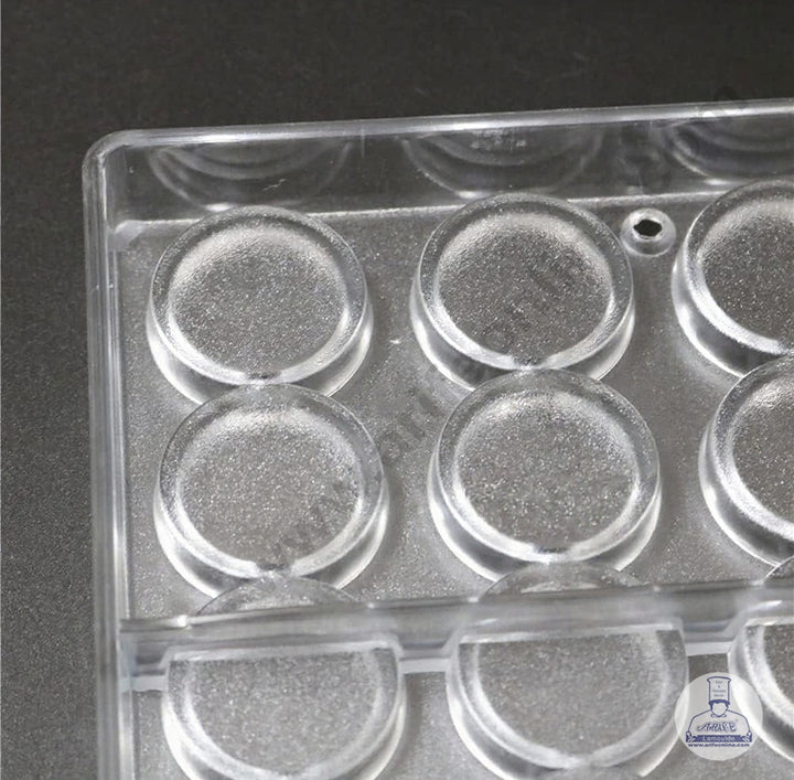 This is a standard professional-grade polycarbonate mold designed for producing classic, uniform, round chocolates, often used for bonbons or flat chocolate discs. The shape is more of an Oblate Disc or a Shallow Cylinder rather than a true sphere.