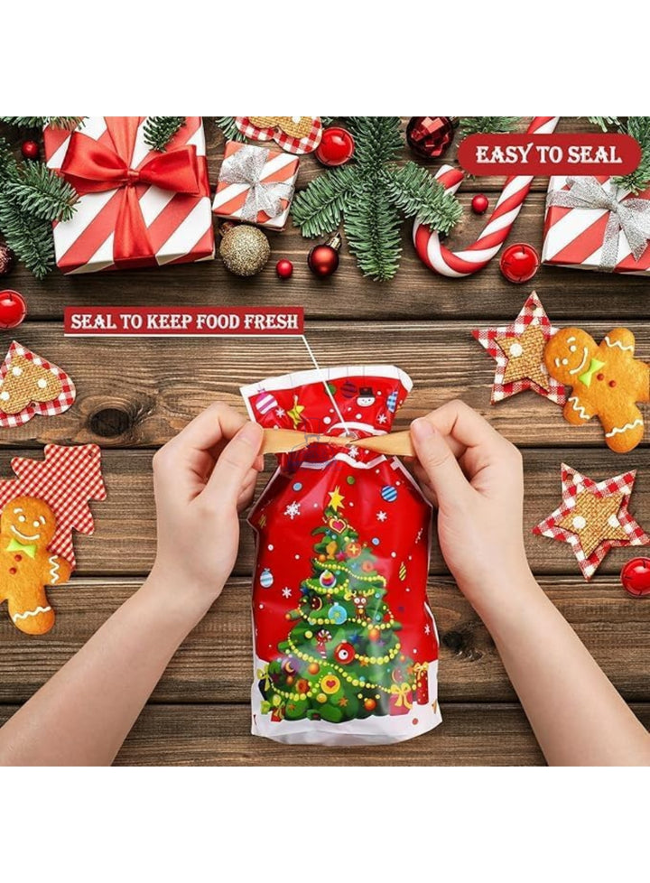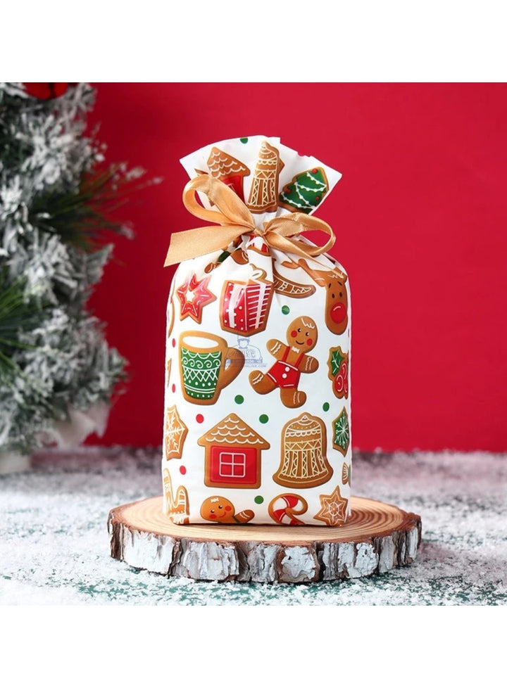 They are designed for the holiday season and feature festive, colorful designs, including a snowman, a Christmas stocking, a decorated Christmas tree, Santa Claus, and gingerbread cookies/bells. The gold ribbon acts as a drawstring closure.