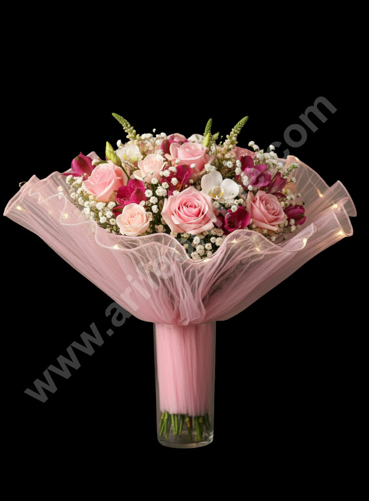 • LED Lights: Integrated LED string lights are a key feature, adding a soft, glowing effect to the bouquet. The lights are usually powered by a small battery pack and are placed along the edges or within the folds of the mesh.