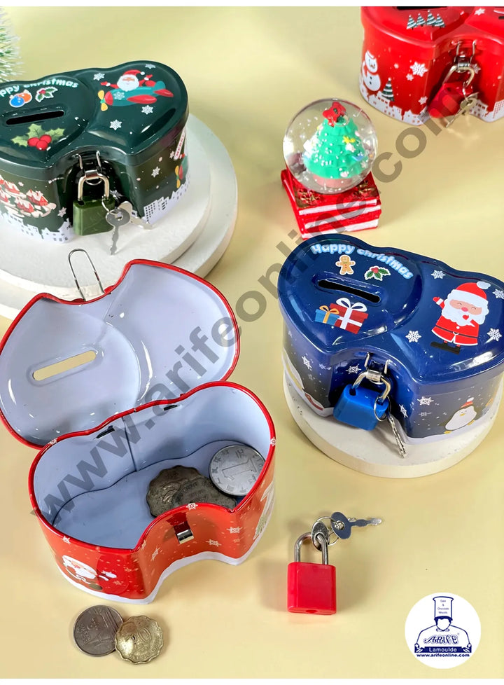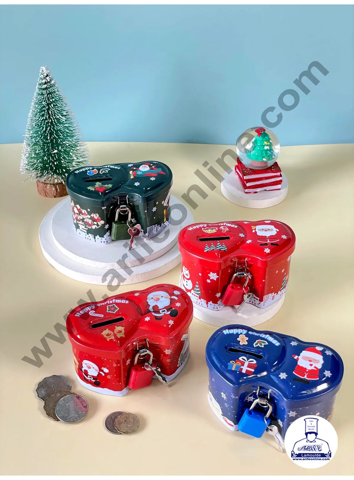 CAKE DECOR™ Cute Christmas Piggy Bank Double Heart Shape Piggy Bank with Metal Lock Key | Christmas Design Coin Storage Box