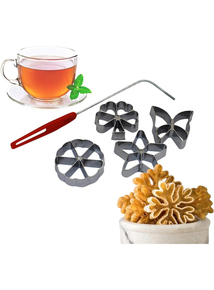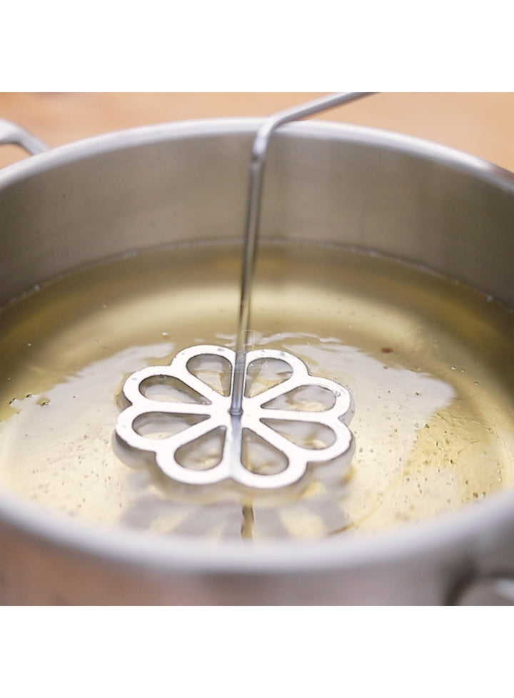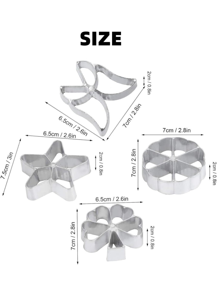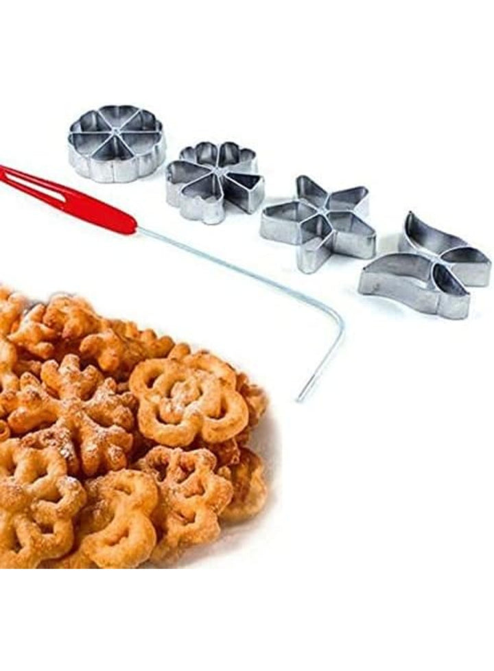 Molds (4 shapes) A set of four interchangeable metal molds (Star/Flower, two different fluted flower/snowflake patterns, and a solid fluted circle). These molds are dipped into batter and then fried to create delicate, crispy pastry shells.
