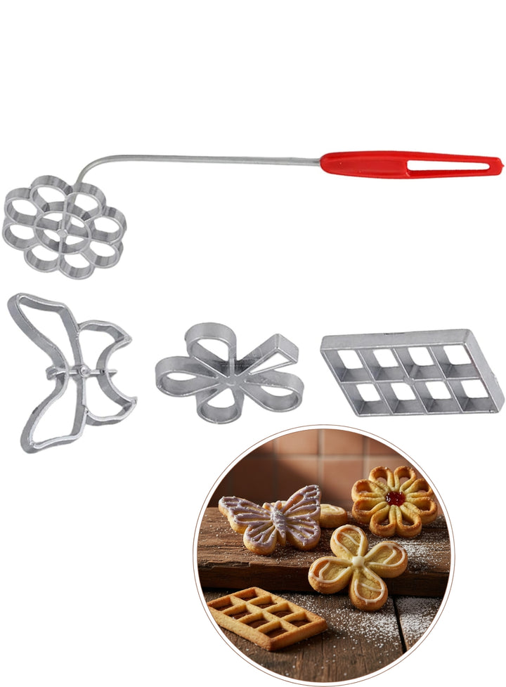 This is a set of metallic molds designed for deep-frying delicate, patterned cookies. The set includes four distinct shapes and a single handle with a red grip, to which the molds attach.