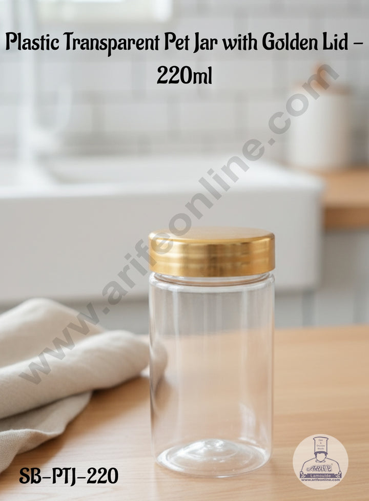 CAKE DECORâ„¢ Clear Plastic Pet Jar with Golden Lid - 1 Piece - 220 ml - SB-PTJ-220
