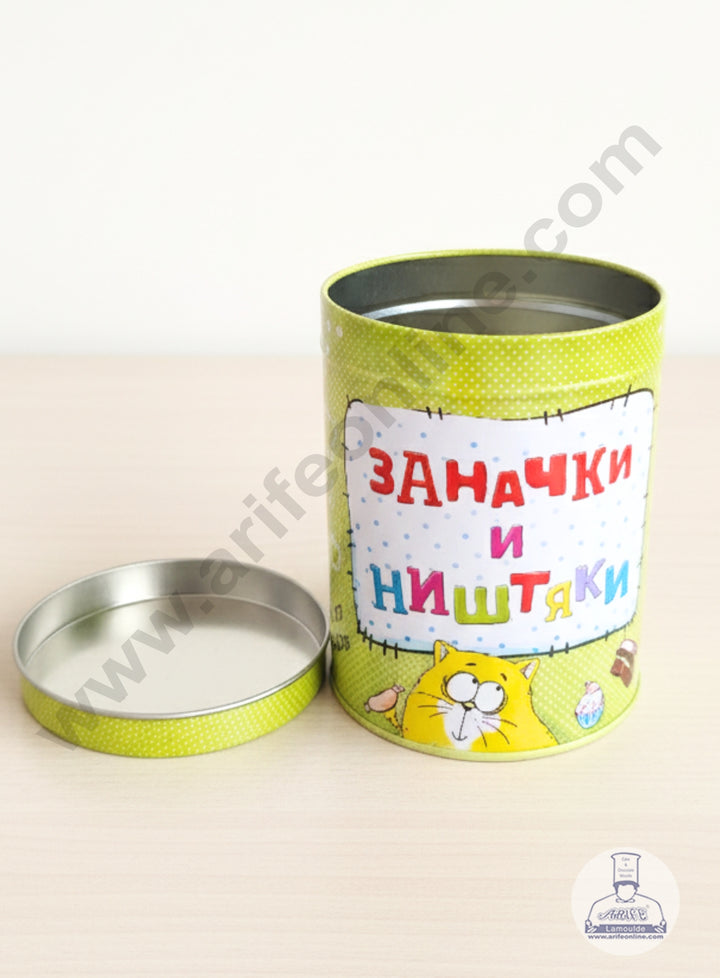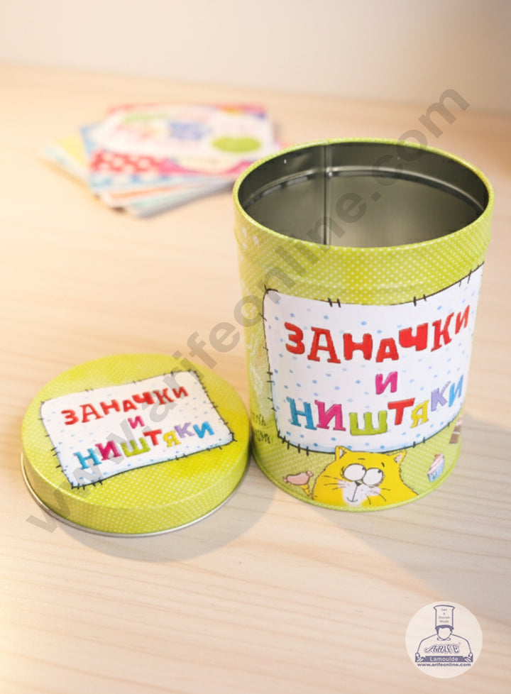 This is a decorative, cylindrical metal storage tin with a removable lid, featuring a whimsical and playful design with text in Cyrillic script, likely intended for a fun or casual use like a money box or snack container.