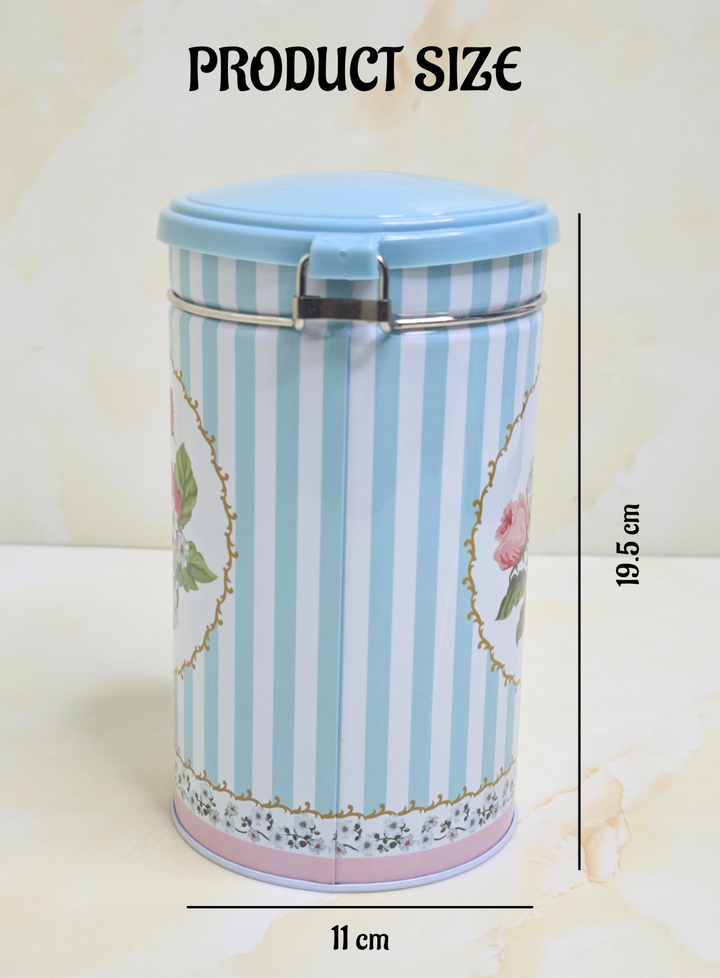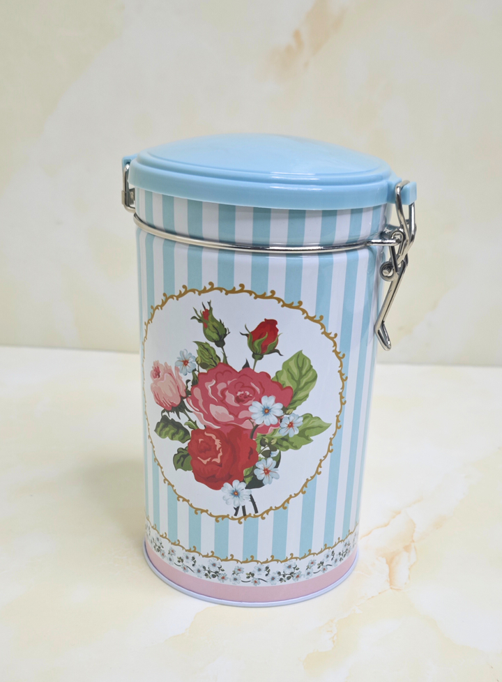 • Body Pattern: The main body features a consistent pattern of vertical light blue and white stripes. Central Motif: A large, prominent oval or medallion-shaped frame is centered on the front of the tin, breaking the stripe pattern. Inside this frame is a detailed and colourful bouquet of roses and other small flowers, accompanied by green foliage. This floral arrangement serves as the primary visual focus. Bottom Detail: A subtle, narrow band or line of light pink is present near the base of the tin, adding a delicate finishing touch.