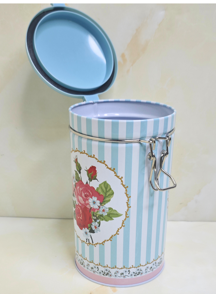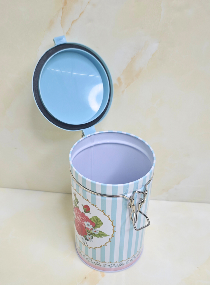 • Material: Body: Metal/Tinplate (tin). Lid: Likely plastic, with a metal clip-down clasp and possible silicone gasket (based on the visible ring inside the lid) for an airtight seal.