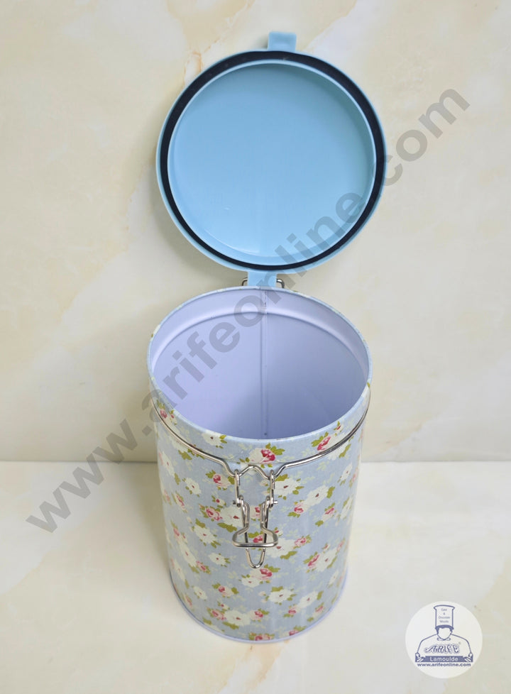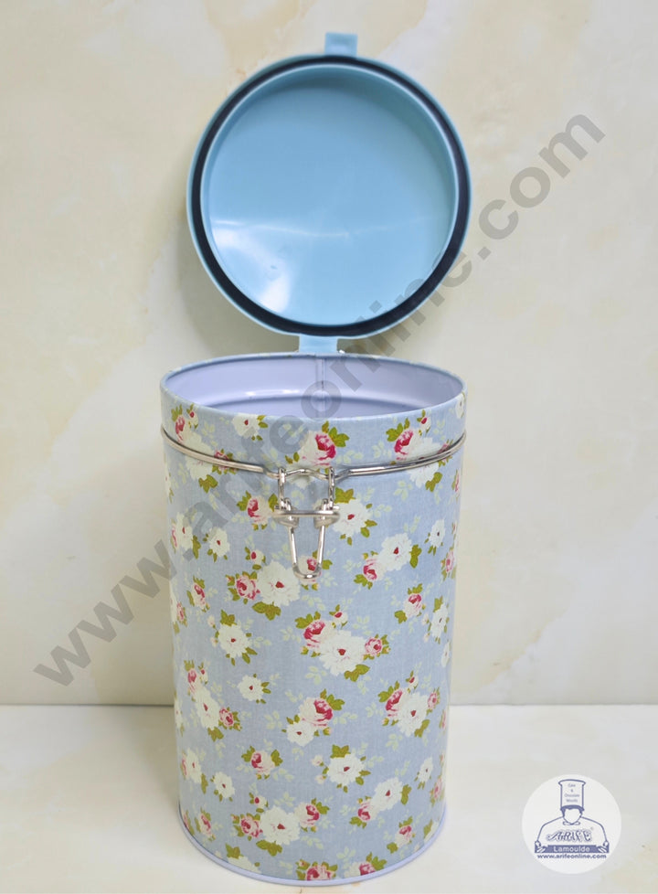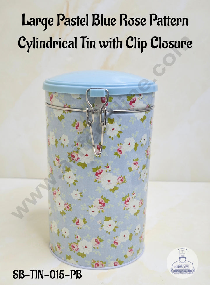 CAKE DECORâ„¢ Large Pastel Blue Rose Pattern Cylindrical Tin with Clip Closure - SB-TIN-015-PB
