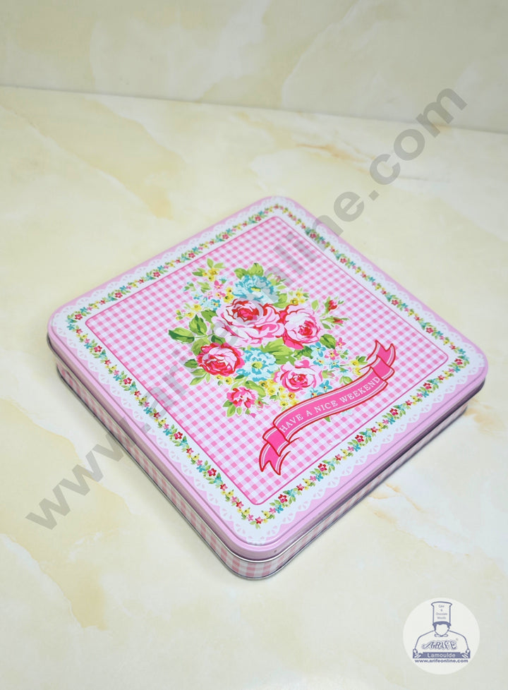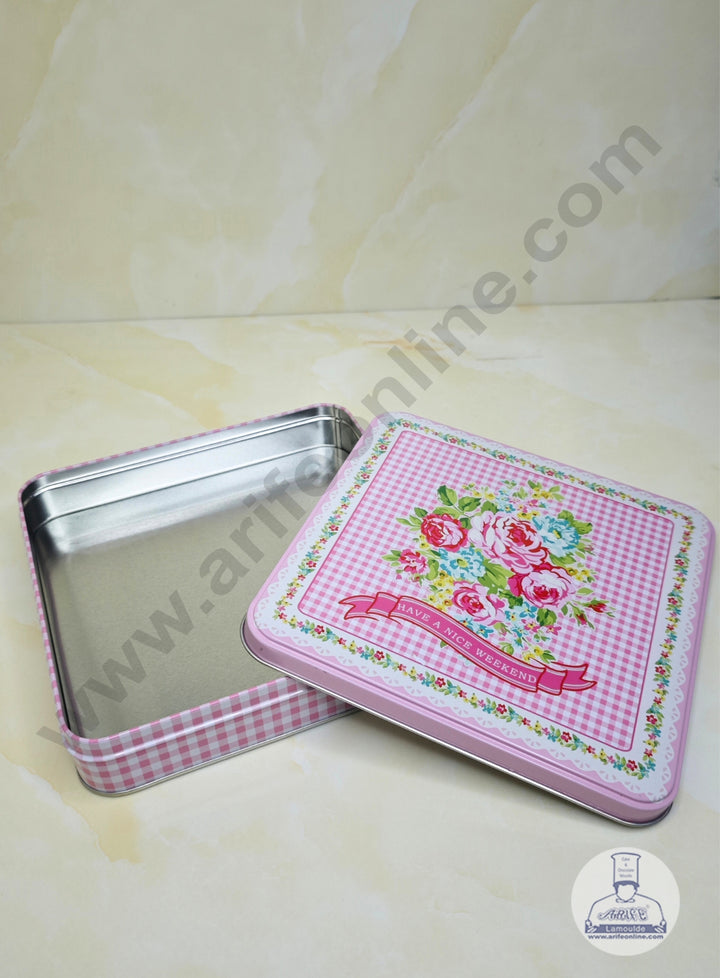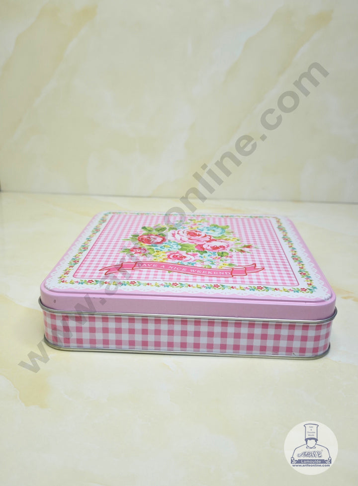 CAKE DECOR™ Large Pink Checkered Rose Print Square  Storage Tin - SB-TIN-017-P