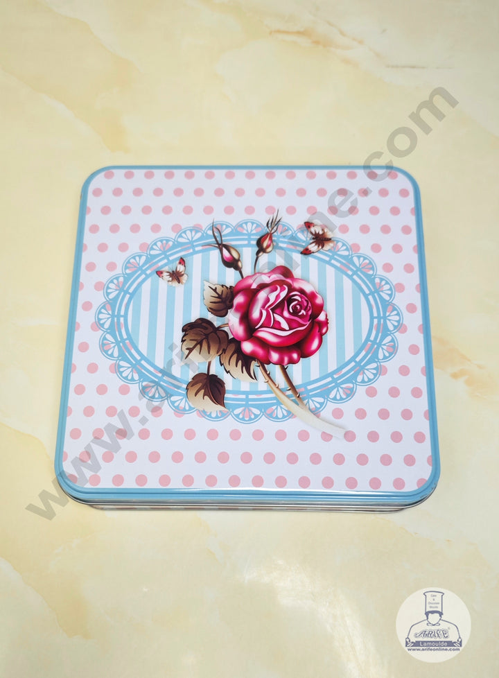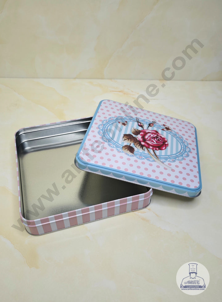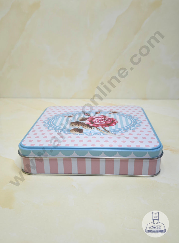 CAKE DECOR™ Large Pink Polka Dot & Blue Striped Rose Square Storage Tin - Length : 19 cm x  Breadth : 19 cm x Height: 4 cm