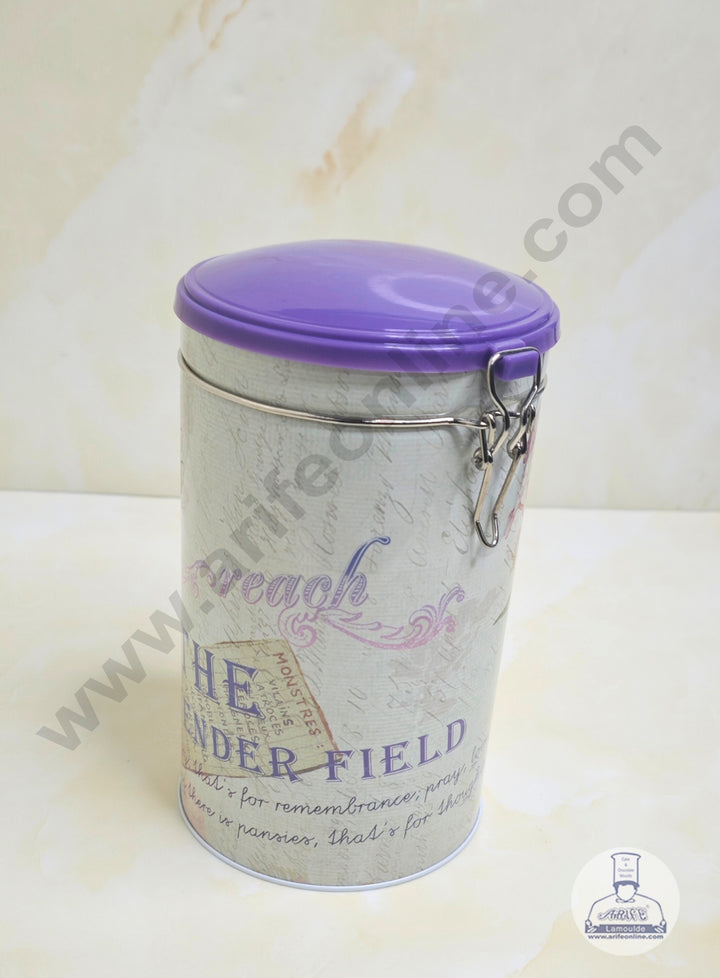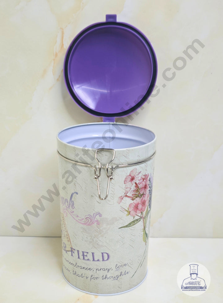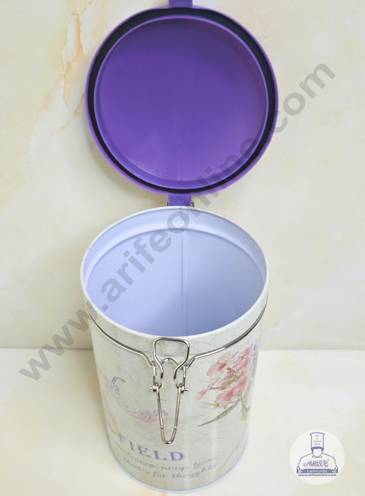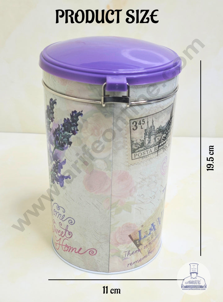 CAKE DECORâ„¢ Large Purple-Lid Botanical Print Cylindrical Tin with Clip Closure - SB-TIN-015-Purple