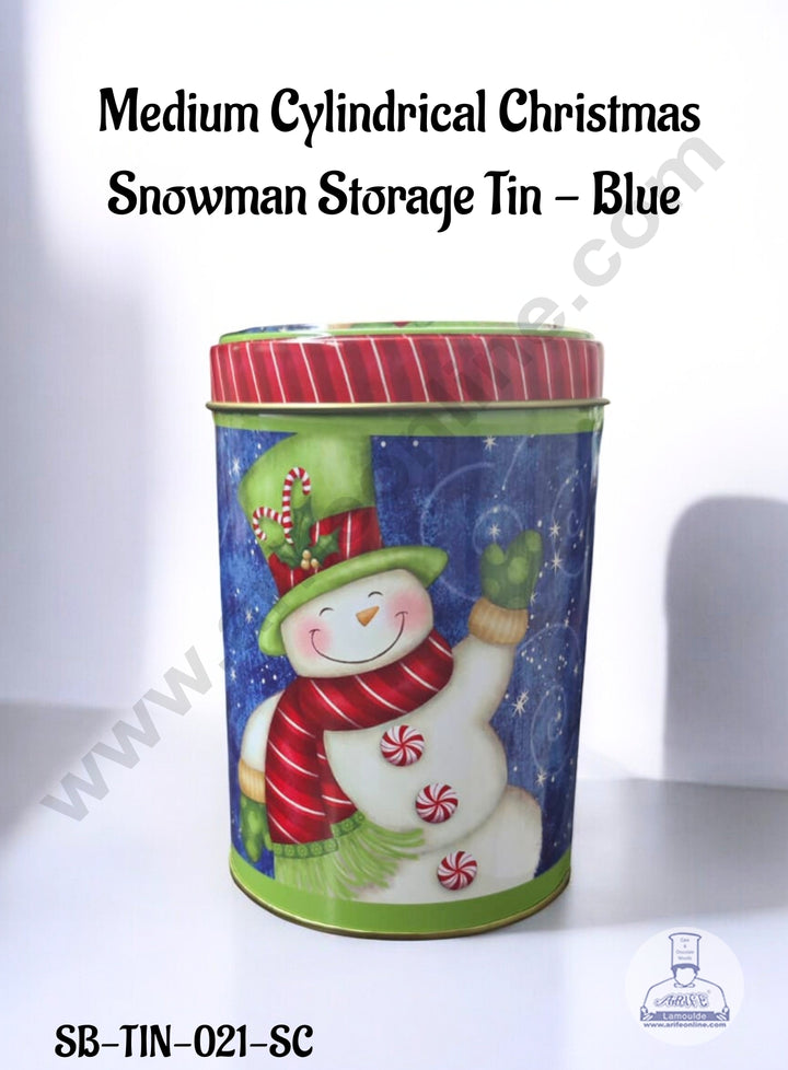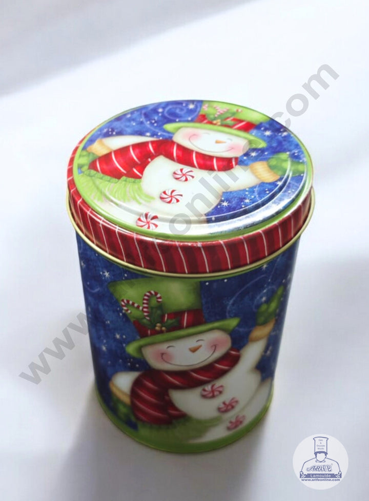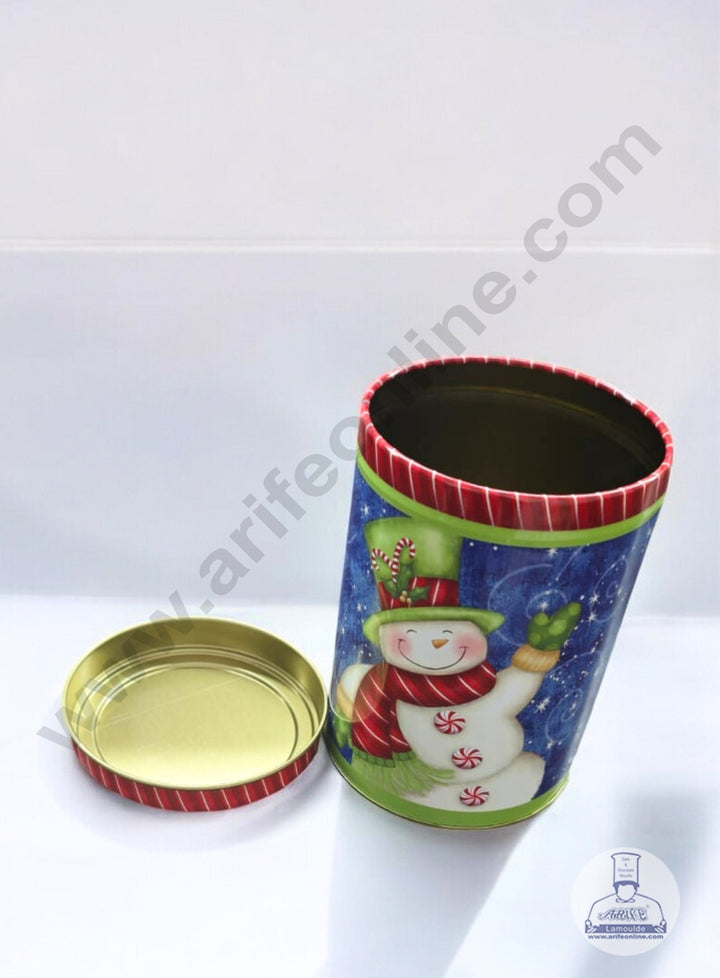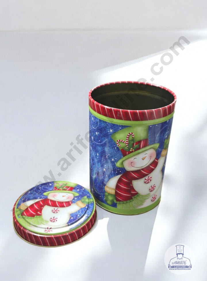 CAKE DECOR™ Medium Cylindrical Christmas Snowman Storage Tin - Blue│Diameter: 8.5 cm x Height: 13 cm│