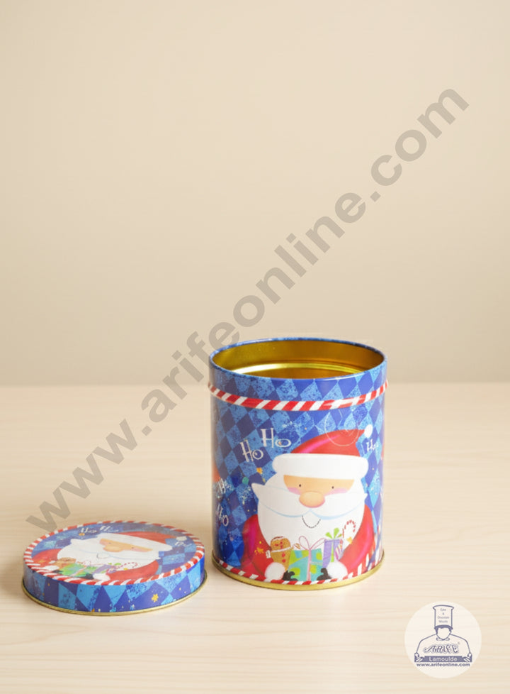 A cheerful, stylized image of Santa Claus is featured prominently on the body and the lid. Santa is shown holding or surrounded by brightly colored wrapped Christmas gifts. The words "Ho Ho Ho" are also visible as part of the motif. Shape: Cylindrical . Separate Lid: It consists of a base and a removable, fitted lid that sits securely on top.