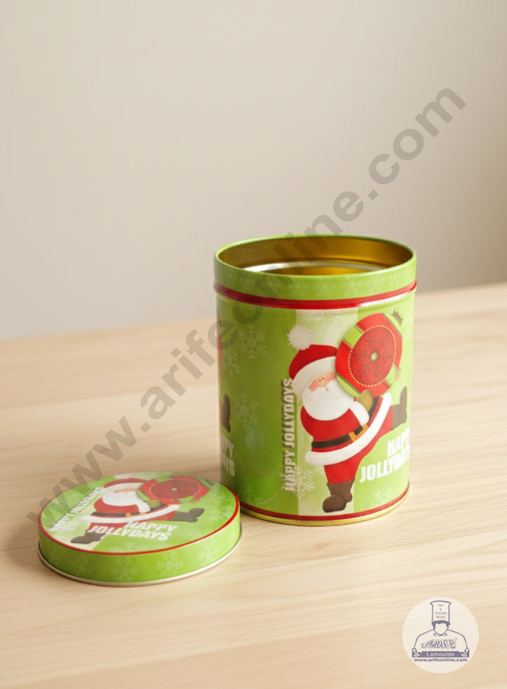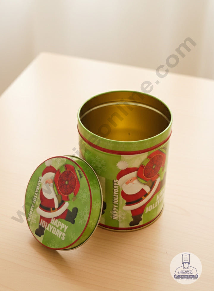 CAKE DECOR™ Medium Cylindrical "Happy Jollydays" Christmas Tin Storage Tin - Green │Height: 13 cm x Diameter: 9 cm │