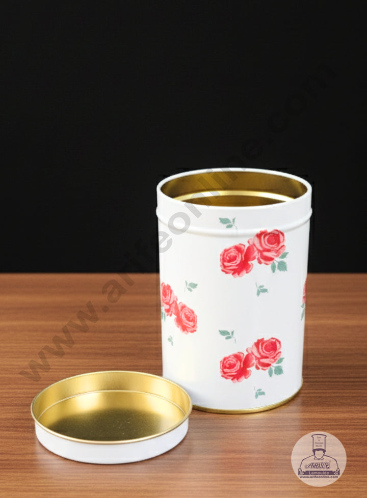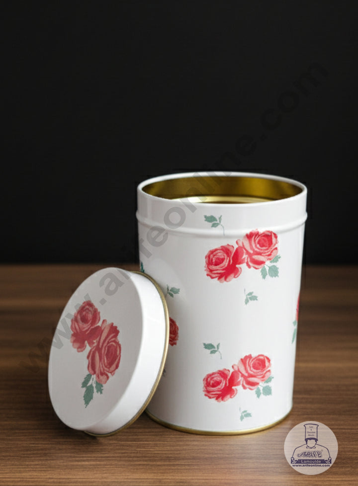 This is a cylindrical metal storage tin with a removable lid, featuring a simple, classic rose floral pattern on a white background.