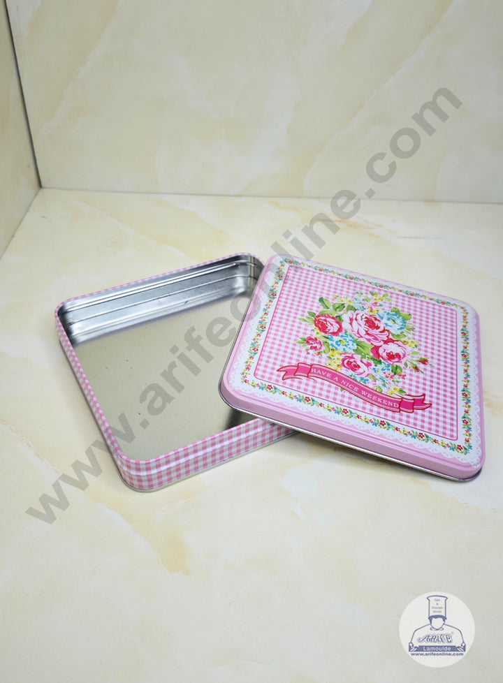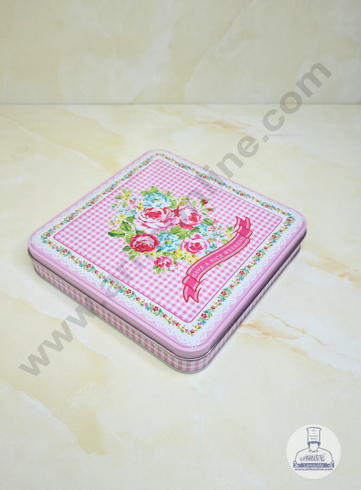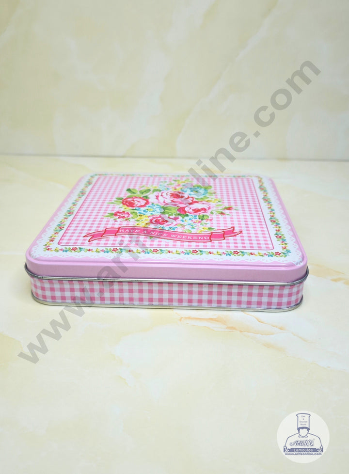 CAKE DECOR™ Medium Pink Checkered Rose Print Square  Storage Tin - SB-TIN-018-P