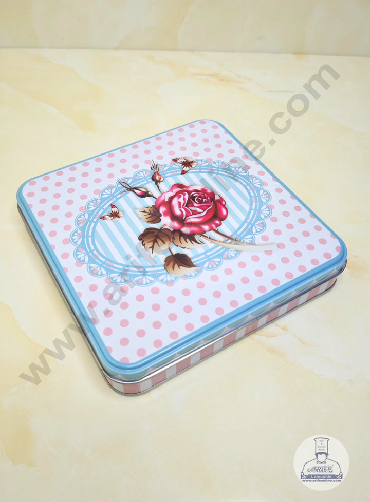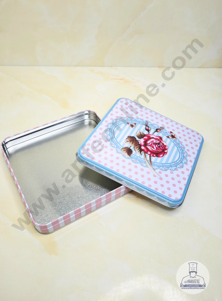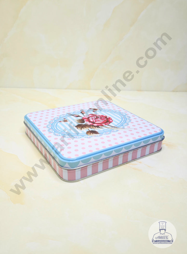 CAKE DECOR™ Medium Pink Polka Dot & Blue Striped Rose Square Storage Tin - Length: 18 cm x  Breadth: 18 cm x Height: 3 cm