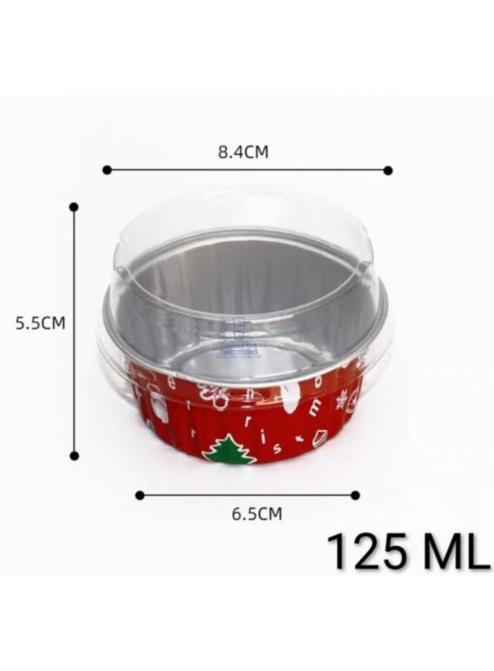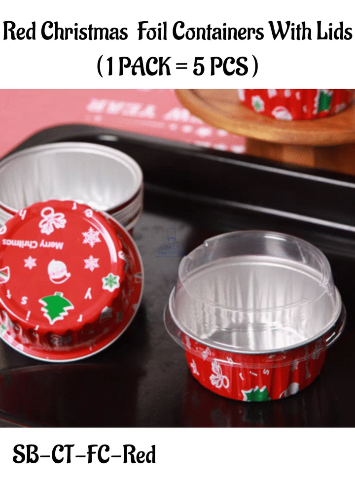 CAKE DECOR™ Red Christmas Theme Round Frill Aluminium Tin Foil Baking Cups with Clear Lid | Non-Stick Bake & Serve Aluminium Containers (Pack of 5)