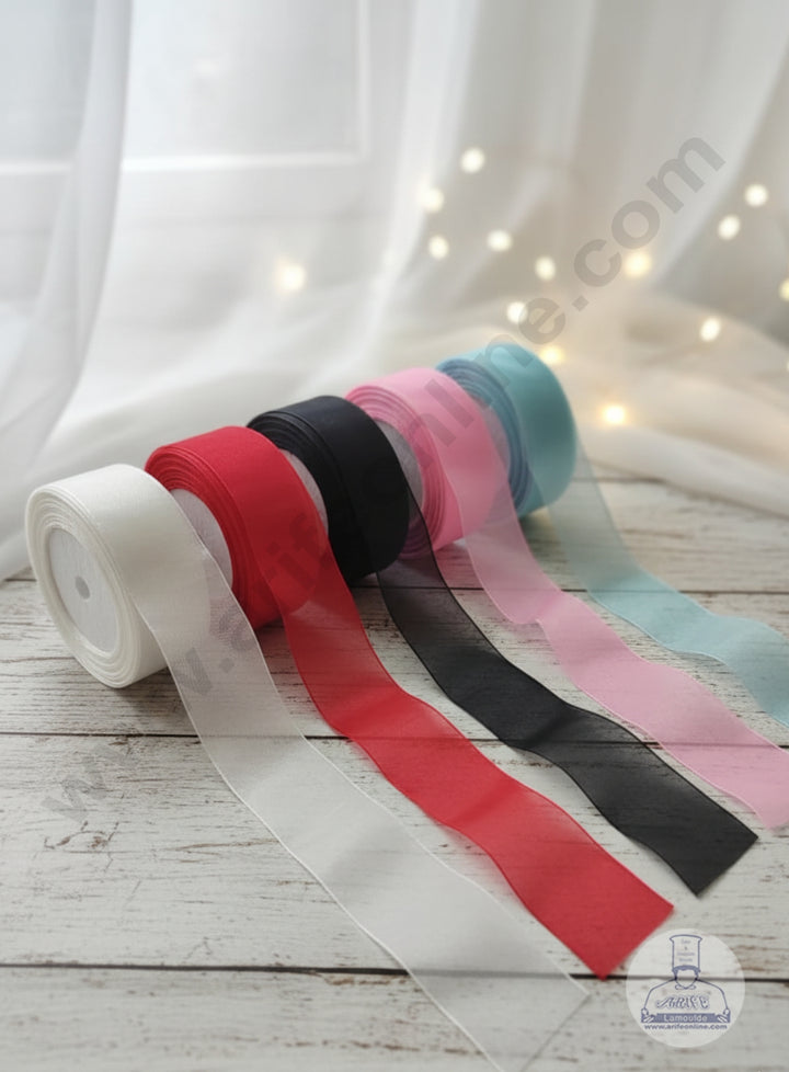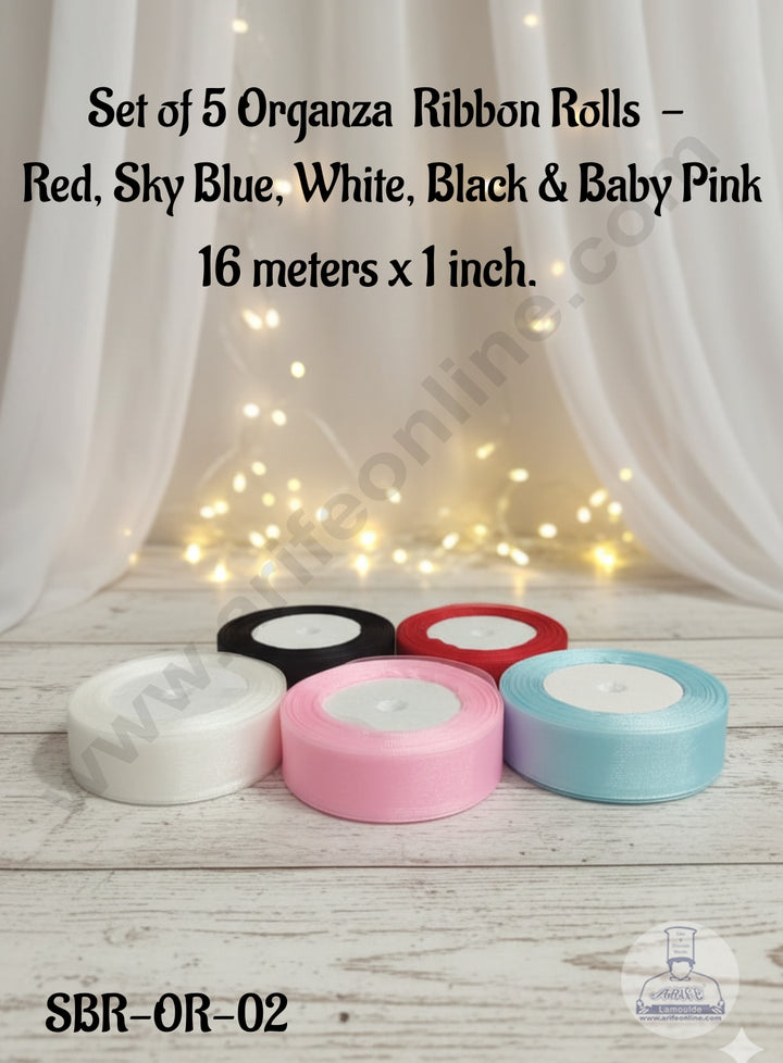 CAKE DECOR™ Set of 5 Rolls Organza Ribbons - Red, Sky Blue, White, Black & Baby Pink| Sheer Ribbon | Gift Wrapping | Decoration (SBR-OR-02)