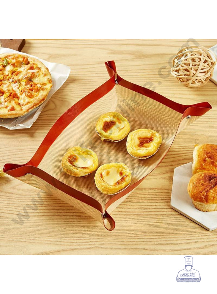 • Design: The design is functional and unique, featuring a durable silicone mat with a distinctive perforated or woven texture (indicated by the "Air Mat" designation) to promote even heat distribution and airflow around the baked goods. The most notable design element is the inclusion of buttons (fasteners or grommets) positioned near each corner and along the longer sides. These buttons are likely intended for securing the mat to a specific baking tray or perhaps for rolling up and storing the mat neatly. The edges are framed by a thick, contrasting red border.