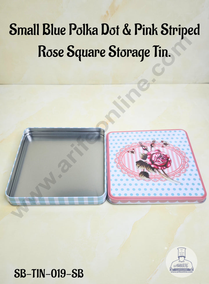 CAKE DECOR™ Small Blue Polka Dot & Pink Striped Rose Square Storage Tin - Length: 16.5 cm x Breadth: 16.5 cm x Height: 2.5 cm