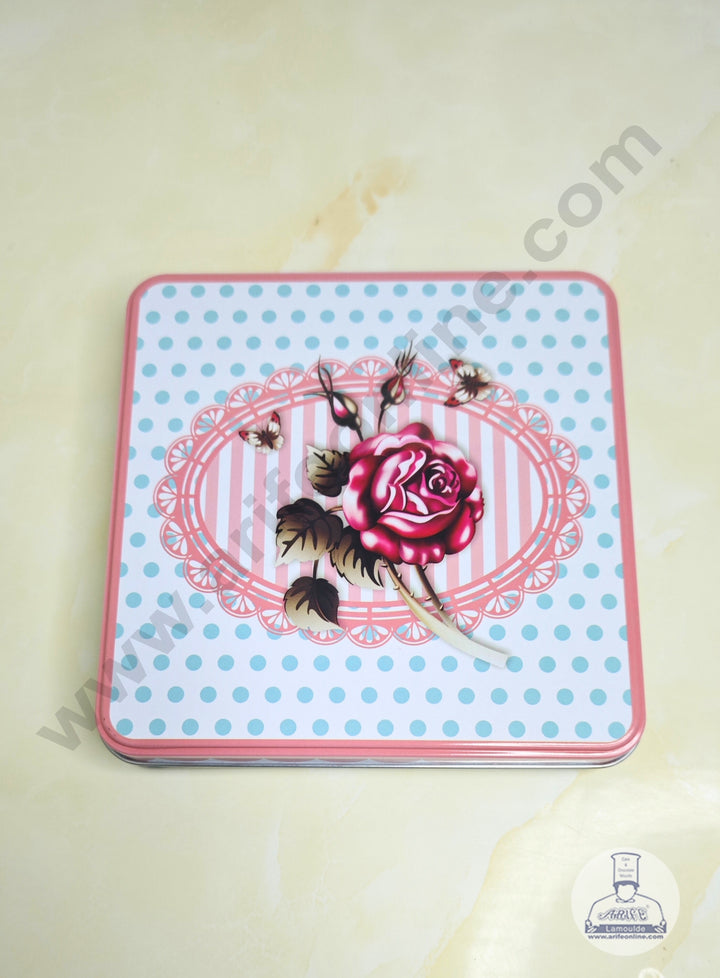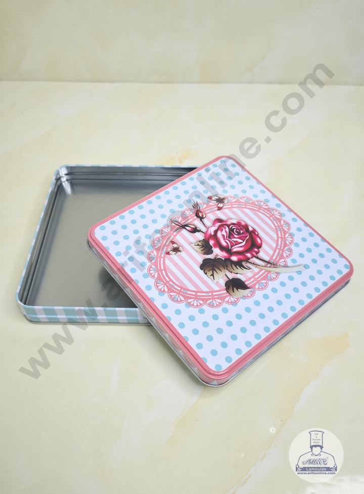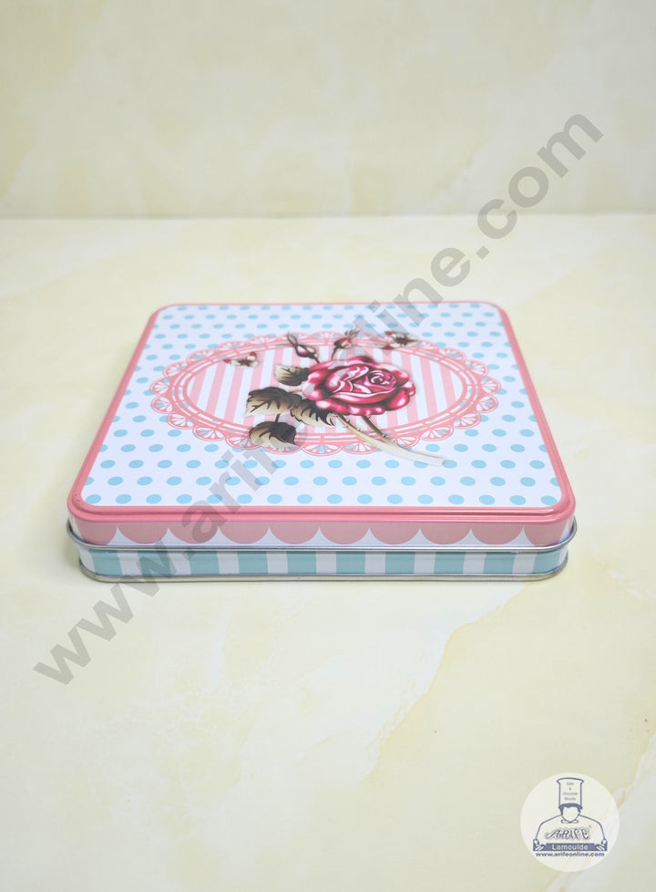 CAKE DECOR™ Small Blue Polka Dot & Pink Striped Rose Square Storage Tin - Length: 16.5 cm x Breadth: 16.5 cm x Height: 2.5 cm