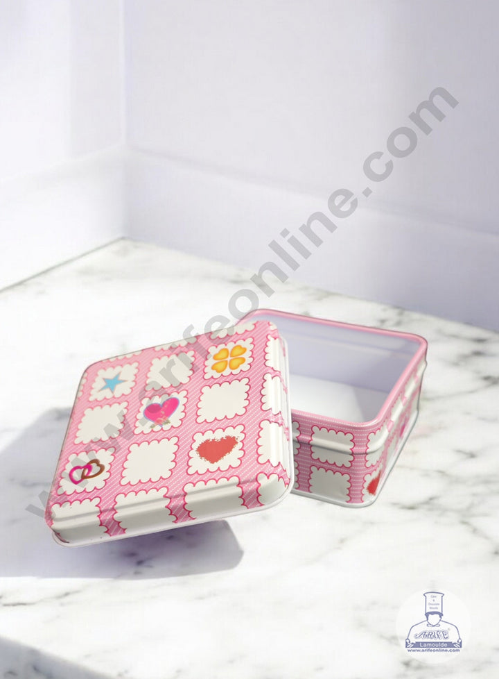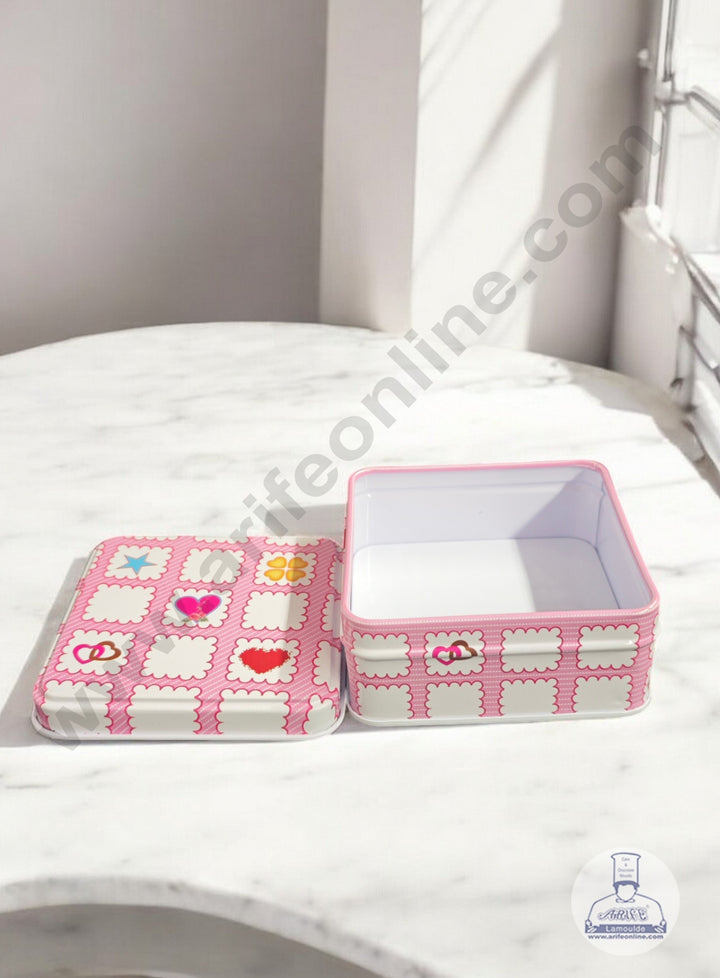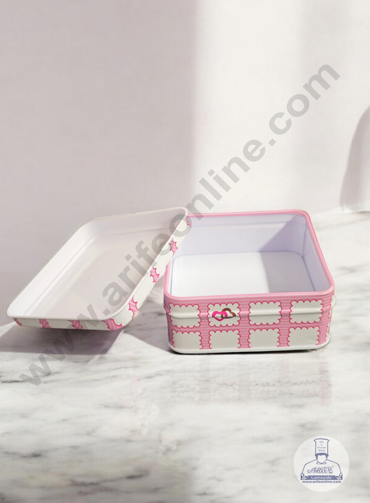 • Side Design: The sides of the tin feature a band that continues the pink gingham pattern and the scalloped white squares, repeating the icon motif.