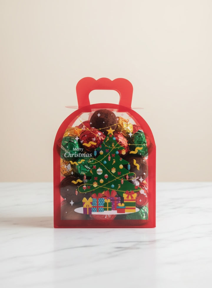 This item is a Handle Treat Box (or small gift box) rather than a traditional flexible gift bag, designed specifically for the Christmas holiday. It combines clear panels for visibility with festive, opaque framing.
