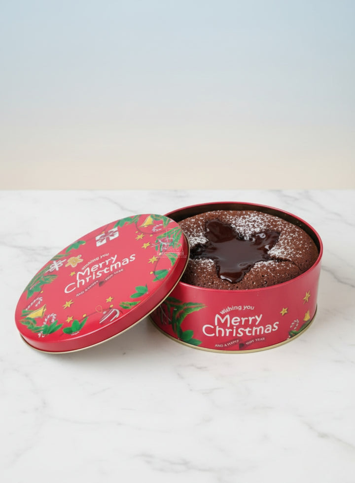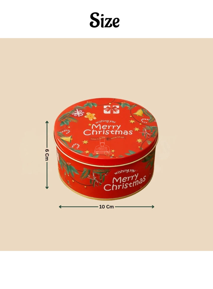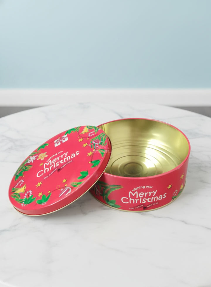 This is a round, red metal tin with a separate lid, clearly marketed for Christmas, as indicated by the text overlay.