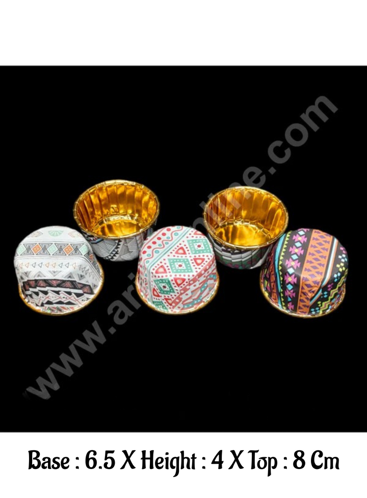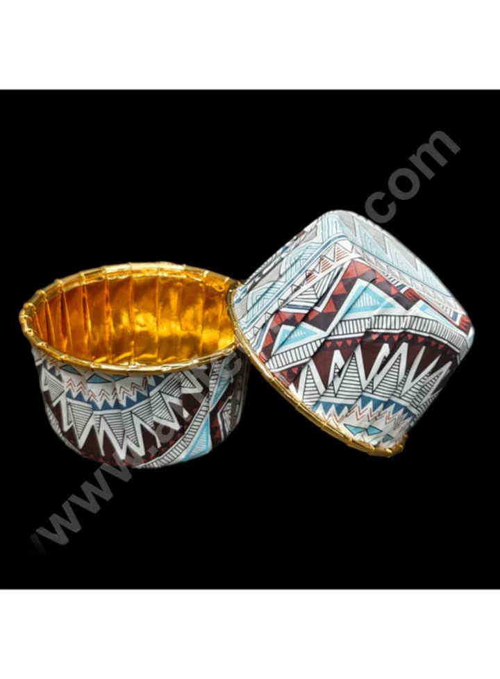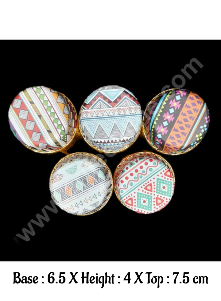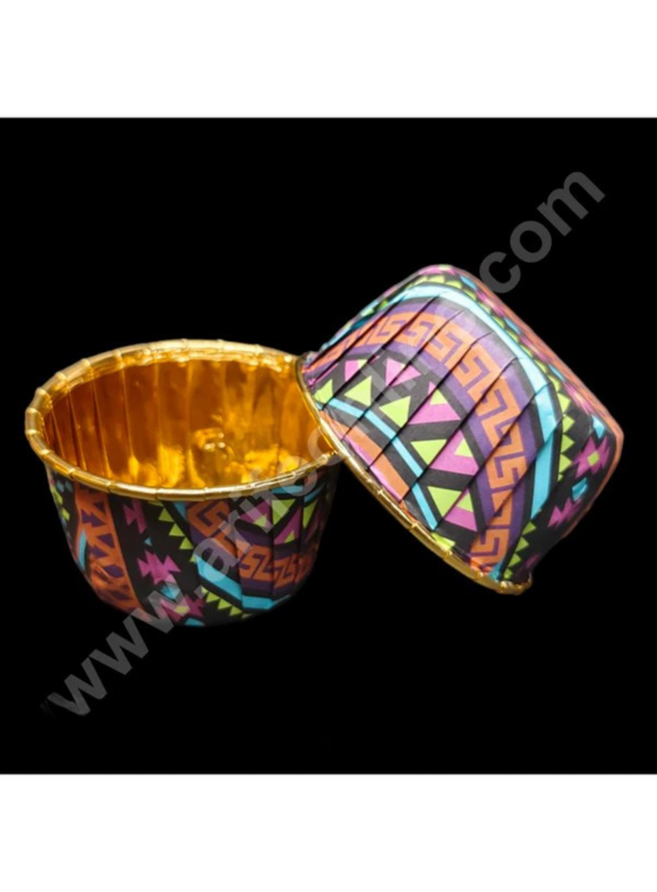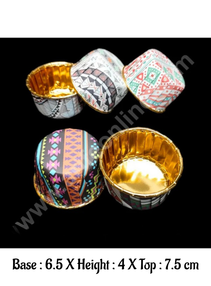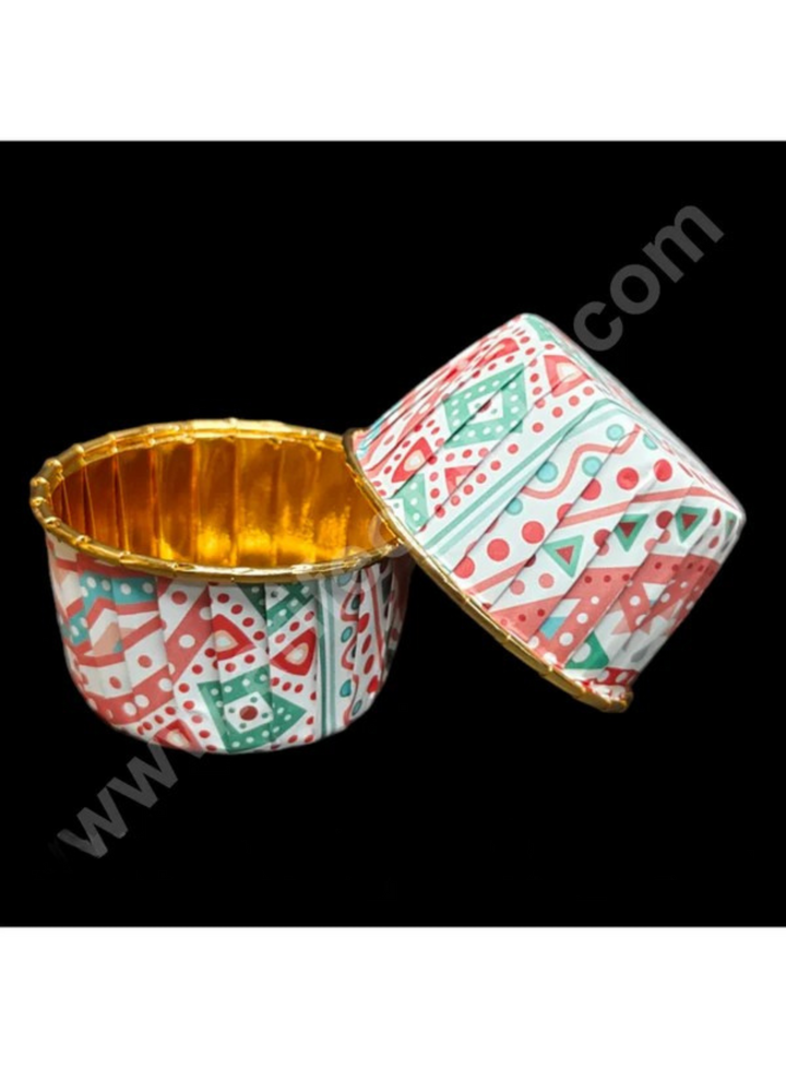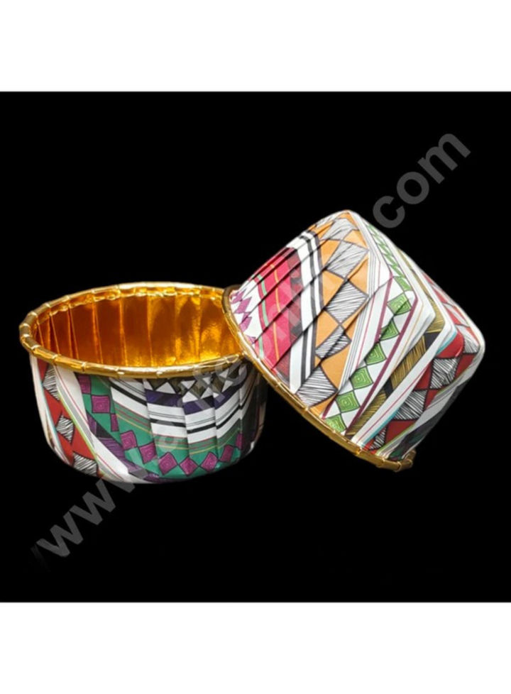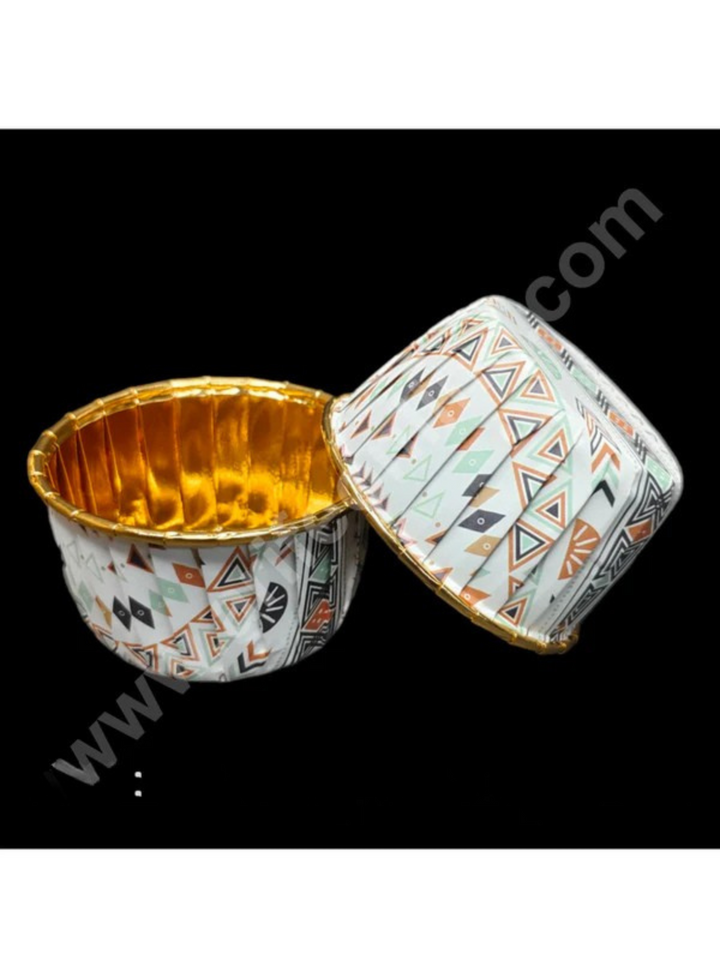 Cake Decor Round Direct Bakeable Cups With Plastic Golden Coating Geometric Design Bake and Serve Disposable Mould 50 Pcs (Assorted Color)