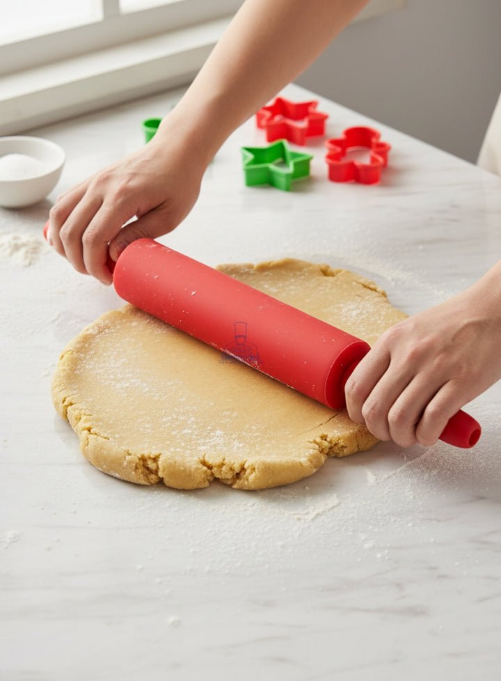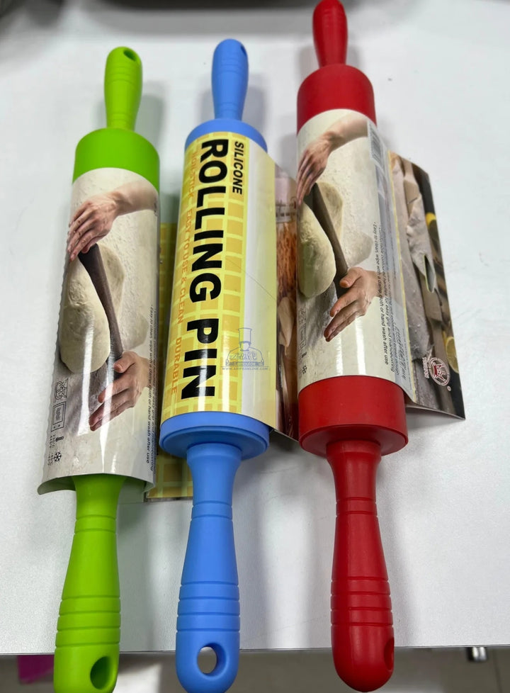 • Design: It has a classic rolling pin design with a central barrel and two ergonomic handles for easy gripping and maneuvering. The "assorted" aspect might refer to the color if it comes in other colors, but this specific one is red. It comes with a product tag wrapped around the barrel, highlighting "SILICONE" and "ROLLING PIN" with claims of being "easy to roll" and "easy to clean."