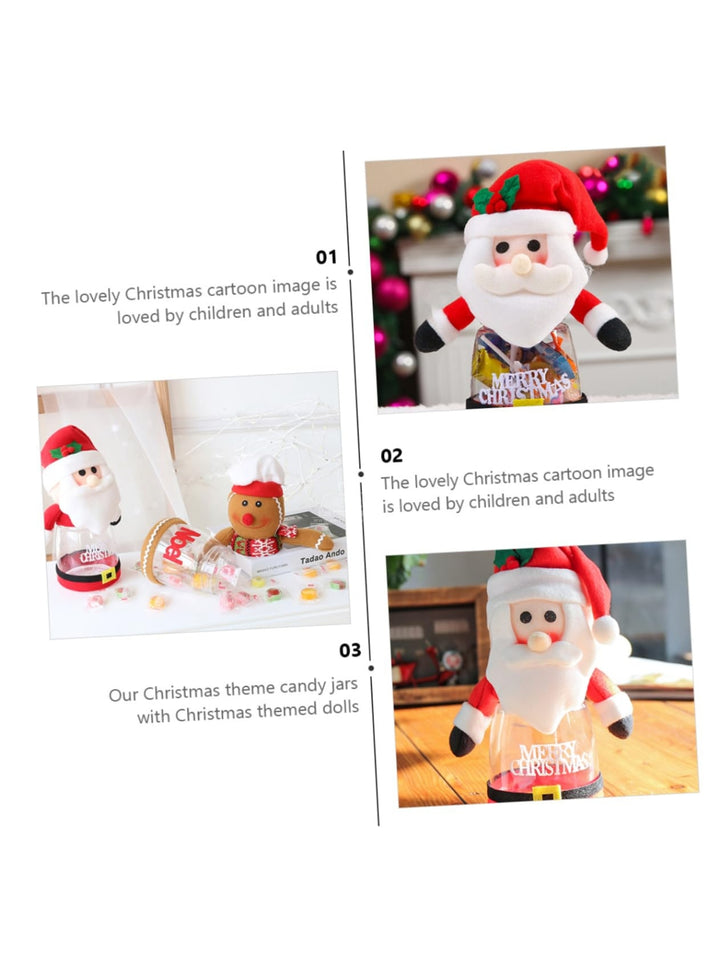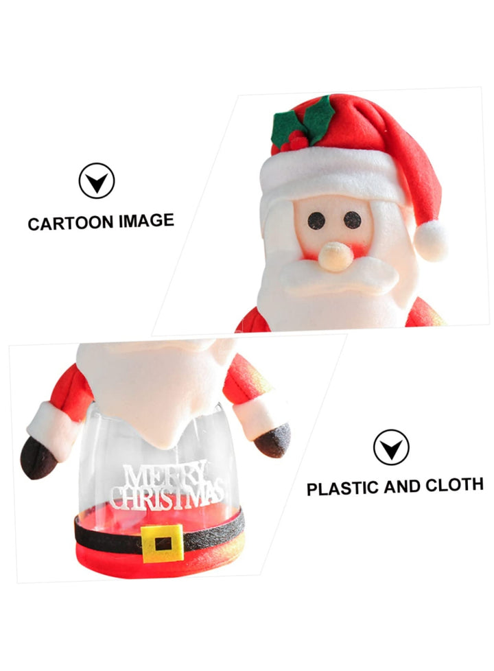 It features a classic Santa Claus design, perfect for small holiday treats, candies, or as a charming decorative piece. The top portion is a plush Santa figure with a traditional red hat, a full white beard, and a friendly face. The lower part is a clear, round jar, likely made of plastic or glass, with "MERRY CHRISTMAS" printed in white. The base of the jar is adorned with a red belt-like design featuring a gold buckle, mimicking Santa's suit.
