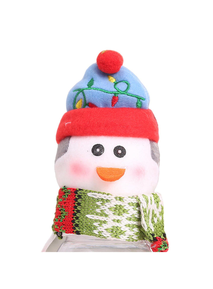 It features a bright and friendly snowman design, ideal for holding small candies, nuts, or as a festive table decoration. The top part is a plush snowman figure with rosy cheeks, an orange nose, a colorful blue and red hat adorned with Christmas lights, and a vibrant green, red, and white patterned scarf. The snowman's grey-gloved arms extend to hug a clear, spherical jar, likely made of plastic or glass, allowing contents to be visible.