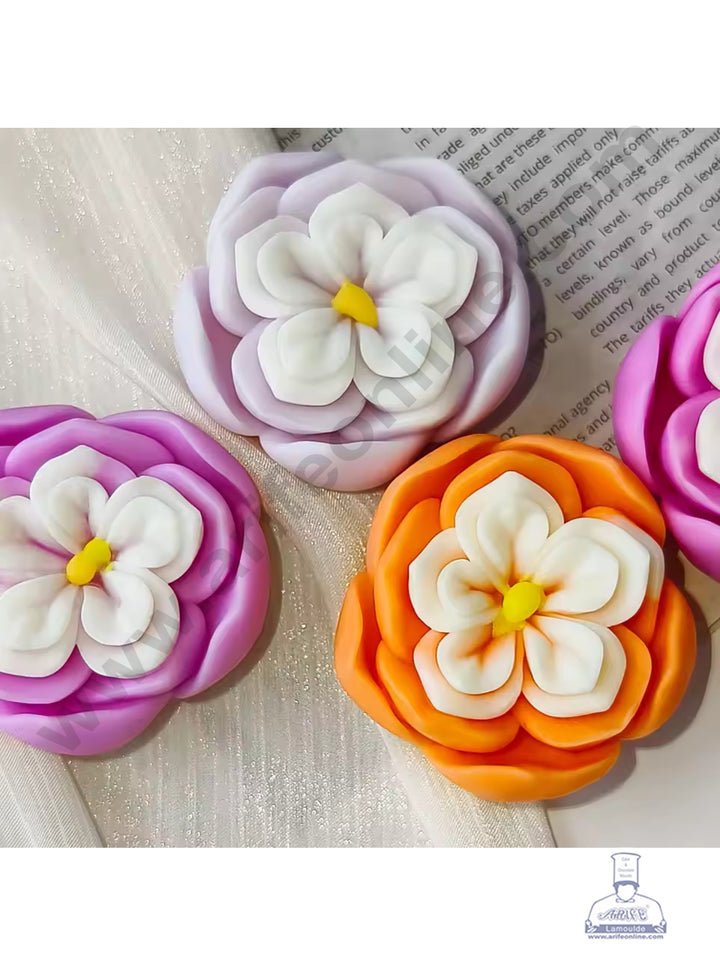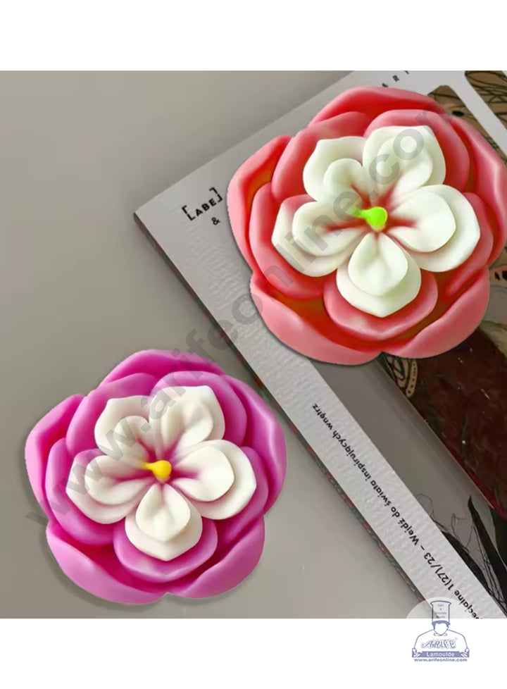 • Shapes & Design:   Flower Type: The flower is designed as a fully open Camellia or possibly a multi-layered Daisy/Peony hybrid. The distinct layers of broad, overlapping outer petals and a clear, compact inner flower. Detailing: The mold excels at capturing the deep curvature and soft edges of the petals. The resulting piece is visually striking, with two distinct layers of color possible to highlight the white center and the colored outer petals.