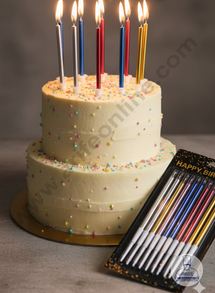 Metallic Long Thin Cake Candle in Holder - Multicolour - 10 pcs pack - CAKE DECORâ„¢