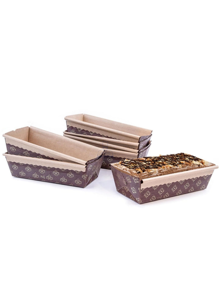 Novacart Direct Baking Moulds are designed to be part of the packaging, eliminate metal baking pans "Bake and Sell". They are of a rigid freestanding construction and are available in a variety of shapes and sizes. Microwave and oven safe up to 390 degrees. Freezer safe as well. Our baking molds standard color is a dark brown paper background with an attractive gold floret print over lay.