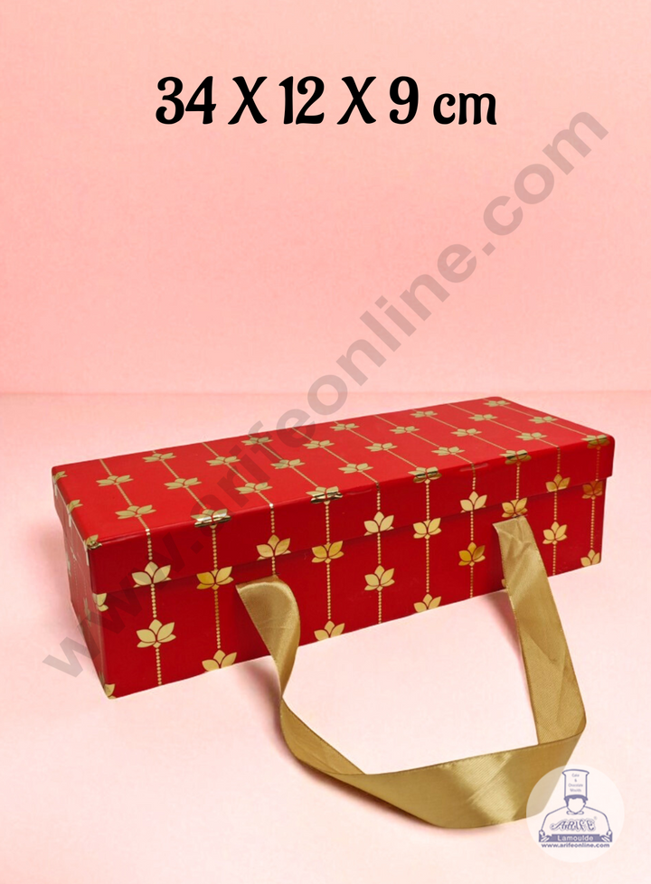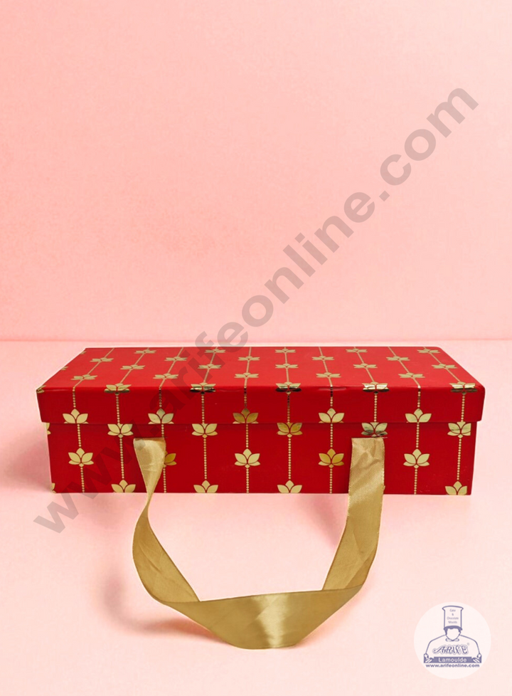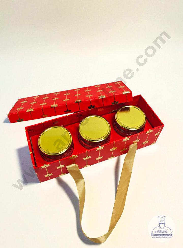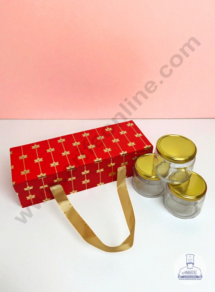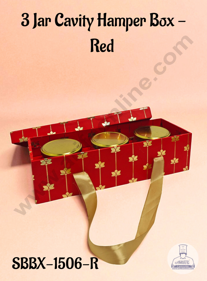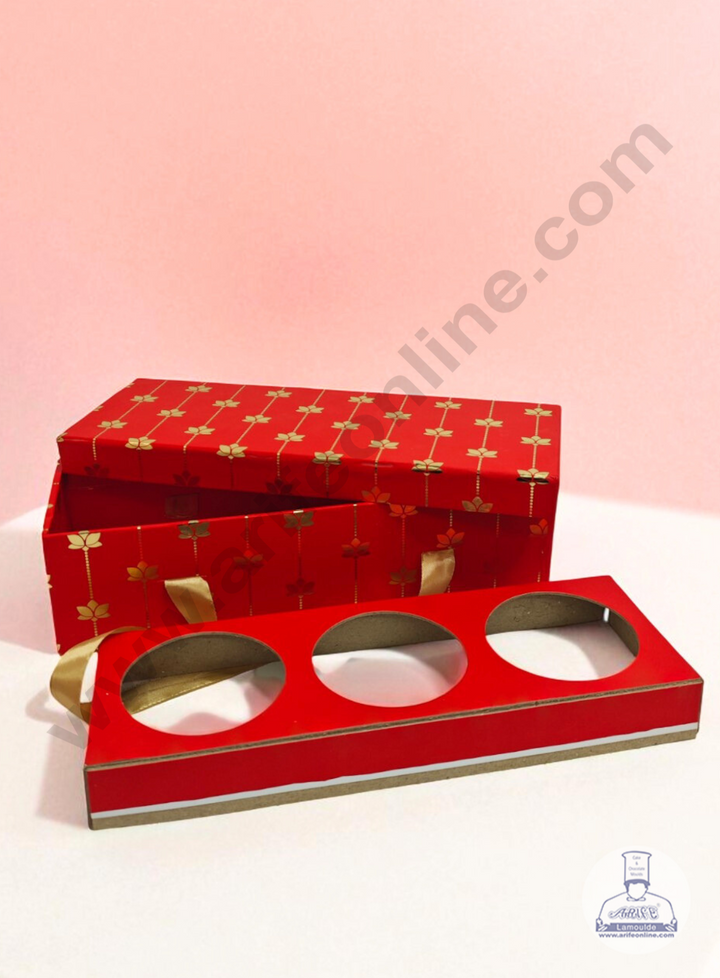 Red 3 Jar Cavity Hamper Box with Gold Lotus Design & Ribbon Handle | 34 X 12 X 9 cm | 1 pc - CAKE DECORâ„¢
